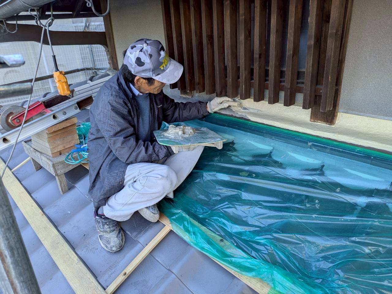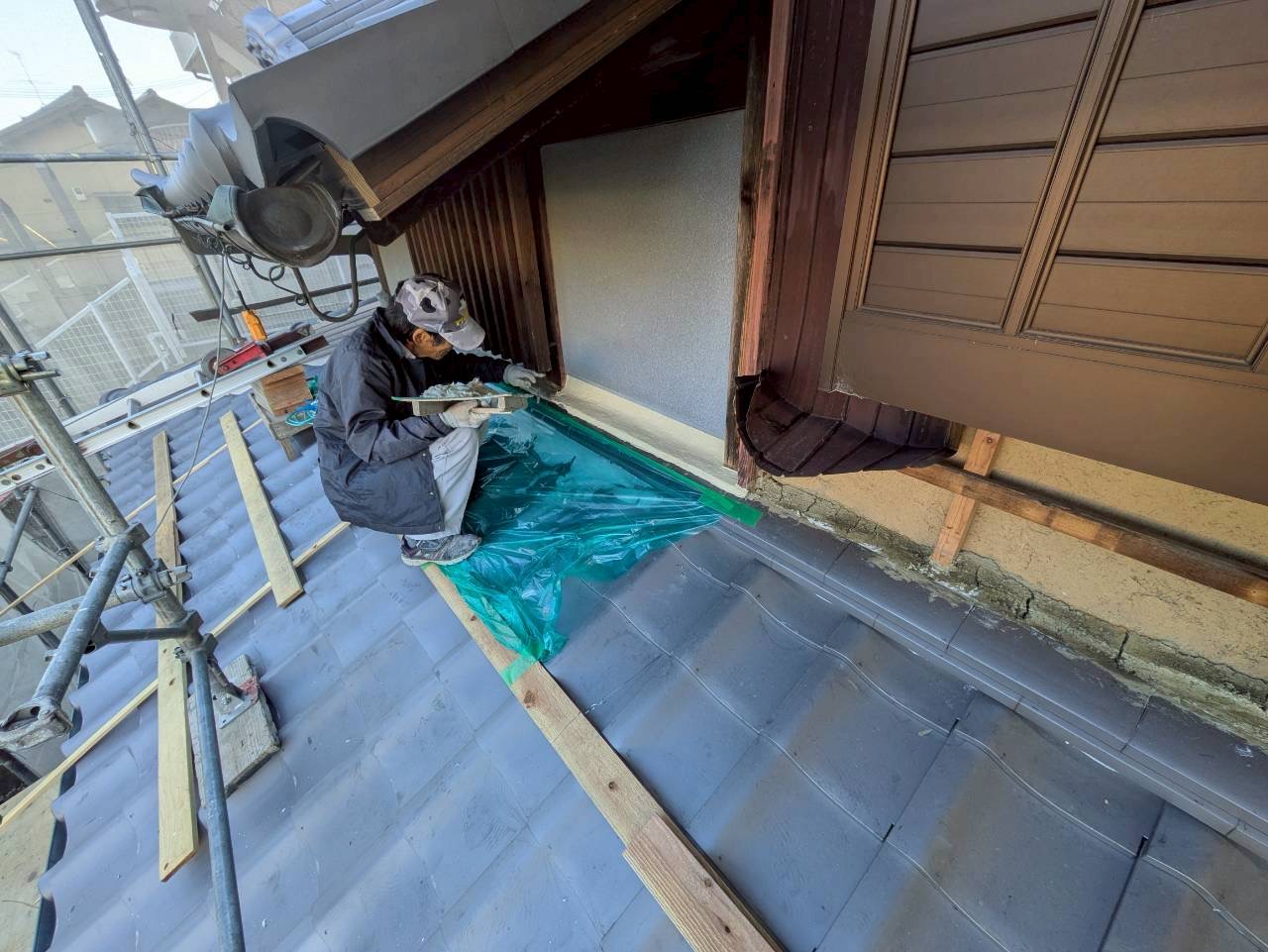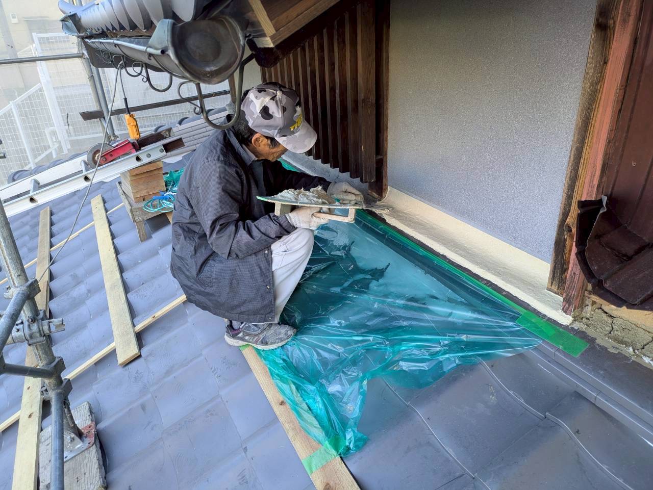下屋根の、熨斗と壁の取合いを左官屋さんが丁寧に漆喰で仕上げていきます。